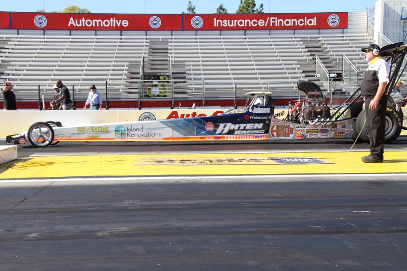 Ahten brings the knowledge and data accumulated a few weeks ago at the Pomona event. Crewchief Al Ahten has the Nitrometane injected tune-up calculated and dialed in. It’s up to Johnny Ahten to step into the spotlight and demonstrate what the car is capable of. Every now and again, Ahten’s car is prone to attempting a high wire act when it launches the front wheels skyward.
