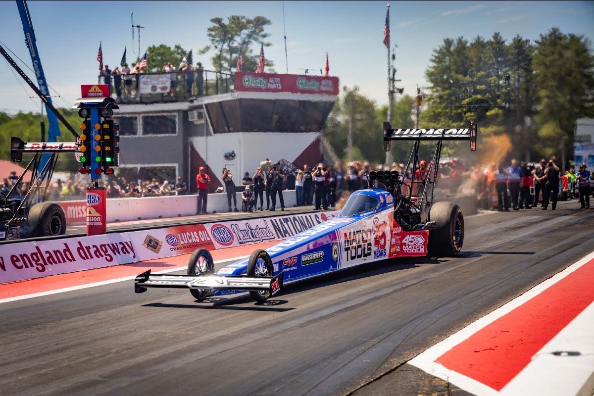 EPPING, NH – Even though Antron Brown rolled into the NHRA New England Nationals as the most recent Top Fuel winner on the NHRA Mission Foods Drag Racing Series tour, he suffered a first-round exit in a marquee matchup Sunday morning at New England Dragway. Brown left the starting line first in his Matco Tools/Lucas Oil/Toyota dragster, but tire smoke ended his day early. Still, the three-time world champion leaves Epping No. 5 in the point standings.