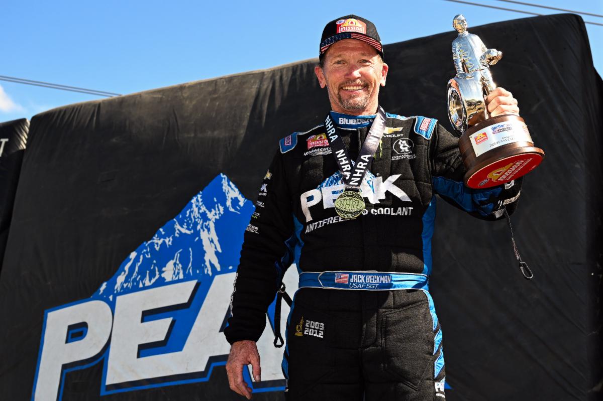 It was just Beckman’s sixth win when starting from the front, his first since 2018 when he won the NHRA Gatornationals at Gainesville, Fla. He now has won four times since first sliding into the cockpit of the PEAK Chevy last August in relief of team owner and Hall of Fame inductee John Force.