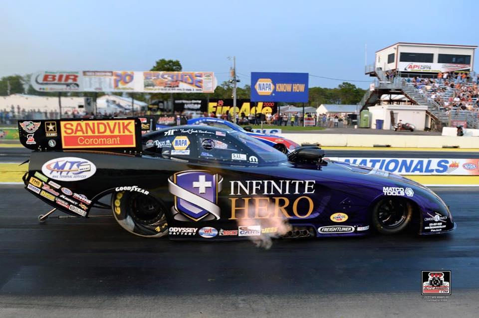 But the Infinite Hero team ended the early night session with a blockbuster time of 3.946 – the third quickest ever giving the team the four best times in Funny Car history. Its speed of 324.75 mph is a track record and the sixth fastest ever.
