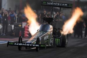 With header flames lit under a Texas sunset, Brittany Force and the Monster Energy team laid down a stellar 3.695-second pass at 333.58 mph to go to the top of the Top Fuel qualifying sheet.