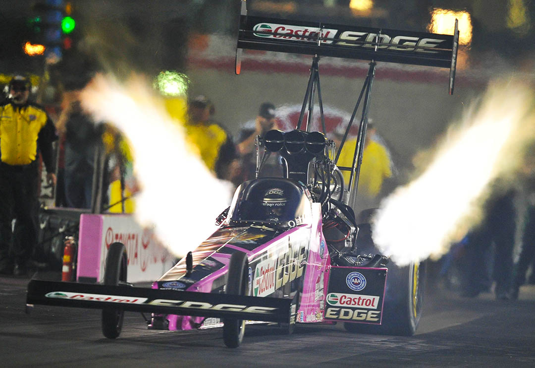 “I have raced Spencer four times this season and even though our car was improving it was still not enough to get passed that talented team. I had an awesome run in the first round in Las Vegas and when I saw that win light I was beyond excited! I couldn’t wait to get to the top end to see my guys and pump them up for the next round. Spencer has been a great competitor and friend out here and he was a real professional after the race,” said Force, who now has a 1-4 record against the Top Fuel driver from Ft. Worth, Texas.