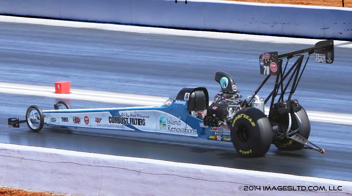 sure of the ability of his car to run well, and he was right. In Friday’s lone qualifying session Ahten and his Island Renovations / Combust Filters dragster laid down a 5.306/269.03 pass that garnered the top spot. Not resting, Saturday saw Ahten go even quicker with a 5.260/265.17 blast to become the number one qualifier going into eliminations. All this was accomplished without two veteran crewmembers.