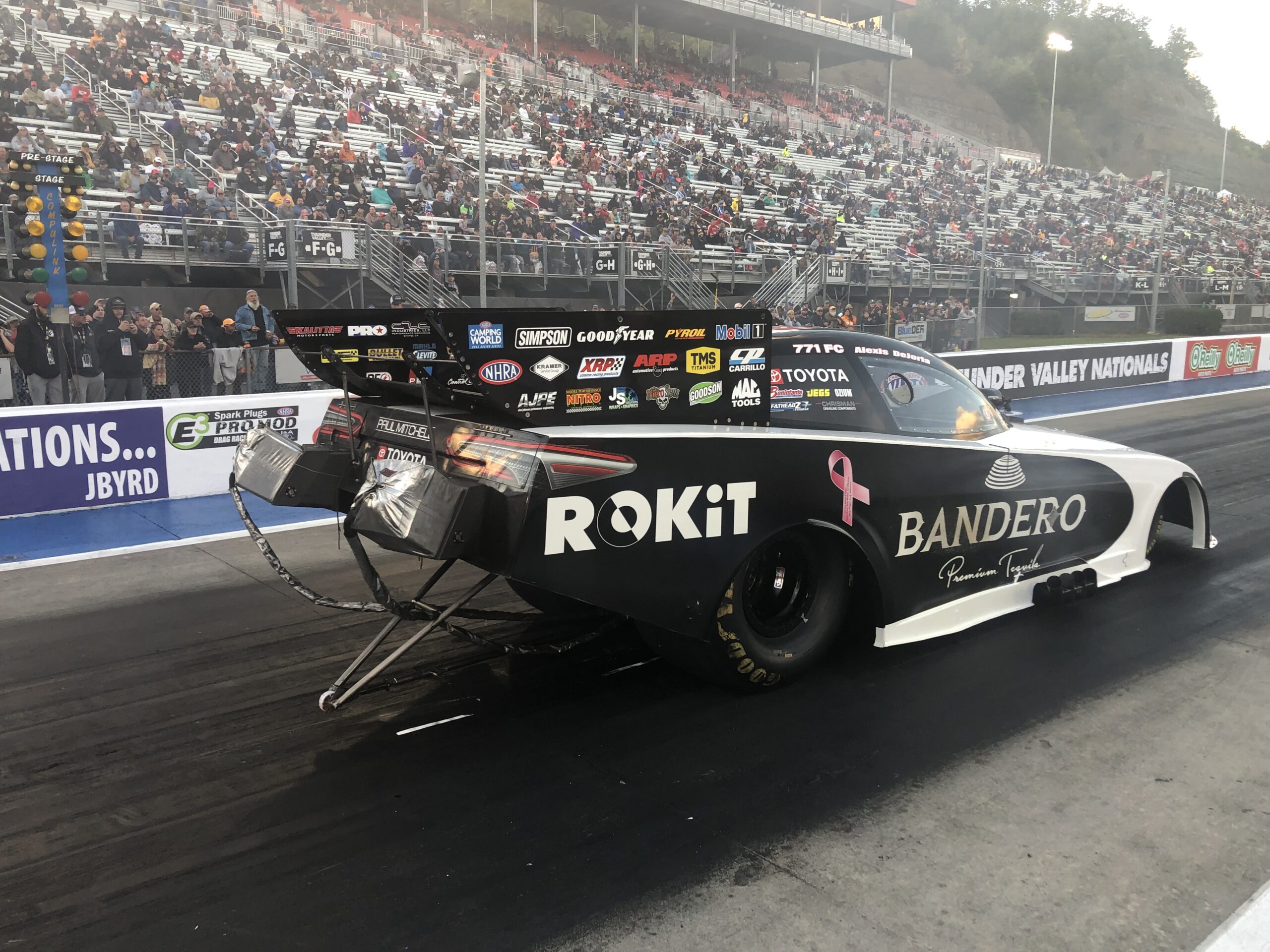 BRISTOL, TN – Alexis DeJoria drove her Bandero Premium Tequila ROKiT Toyota Camry Funny Car to the No. 1 qualifier position today at