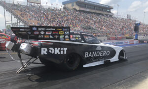 and the ROKiT Bandero Premium Tequila Toyota Camry Funny Car. The veteran driver came out of the trailer on Saturday with one of quickest Funny Cars on the property racing to the No. 1 spot after the first qualifying session. The Friday qualifying session was cancelled leaving the race teams with just two shots to get the most data and additional rain storms in the forecast. DeJoria’s quick time on Saturday earned her three qualifying bonus points and lit up the scoreboard with an impressive 3.912 second pass at 307.44 mph. As quick as the run was, the team knew there was more out there on the performance side for the ROKiT Bandero Premium Tequila Toyota team.