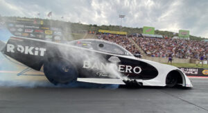 The Bandero Tequila ROKiT Funny Car lined up in the right lane for the solo run. DeJoria launched hard and as she approached the 330 feet mark her race car was dropping cylinders. Her team remotely shut off her race car to preserve parts before heading into the quarterfinals.