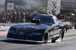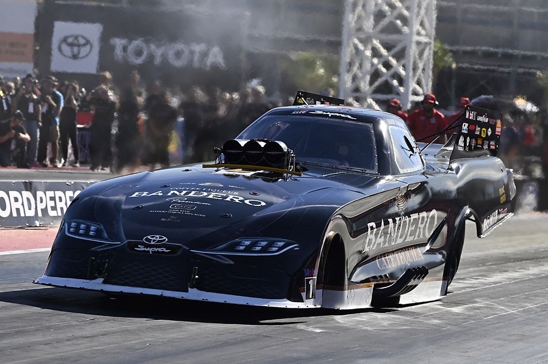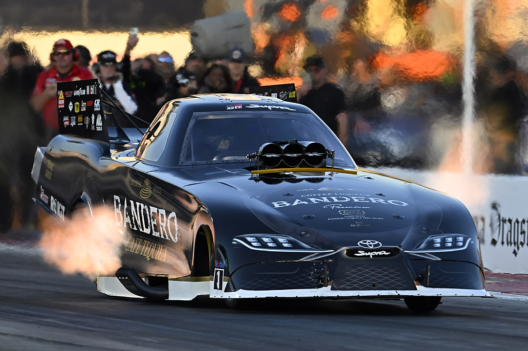Aboard the Bandero Café Toyota GR Supra, DeJoria clocked three three-second passes in qualifying despite dealing with chassis issues to secure a spot in Sunday’s elimination show. With 21 Funny Cars vying to get into the 16-car field, DeJoria’s best run of 3.918 seconds at 330.96 mph put her 10th on the ladder and pitted her against fellow Toyota driver Ron Capps in the opening round of eliminations. The veteran drivers left the starting line together in what was shaping up to be an exciting side-by-side race until DeJoria’s machine encountered issues as she approached halftrack. She slowed to a 4.209-second pass while Capps was able to drive away with the win and advance into the second session on the strength of his 3.917-second run.