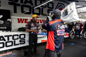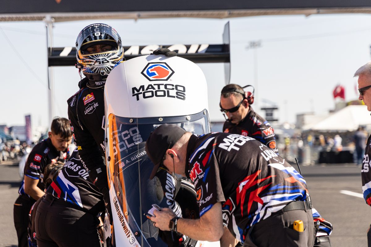 champion Antron Brown faced vastly different conditions at the NHRA Arizona Nationals at Firebird Motorsports Park. Brown in his Matco Tools dragster made the second-quickest pass of Sunday’s first round of eliminations, but a dropped cylinder in the second round ended Brown’s day. The hot conditions gave crew chief Brian Corradi and the AB Motorsports team valuable data along with confidence in their ability to adapt to a wide range of variables.