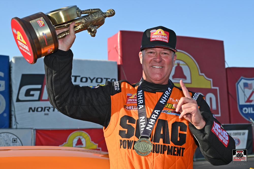 Pro Stock points lead in the process of winning sixth race of the season Monday at the postponed Ford Performance NHRA Nationals at The Strip at Las Vegas Motor Speedway.