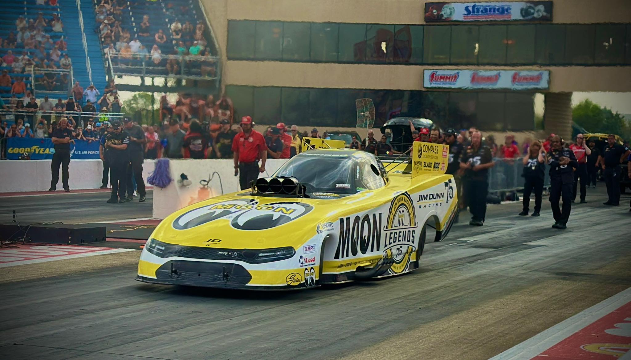 New England Nationals at New England Dragway, May 30-June 1. Their striking 75th anniversary Mooneyes livery, making its third appearance this season, will make its furthest eastward debut, bringing a new level of style and performance to the east coast. Longtime sponsor Compass Facility Services will also be featured more prominently on the back wing of the nitro Funny Car for this race and the Thunder Valley Nationals.