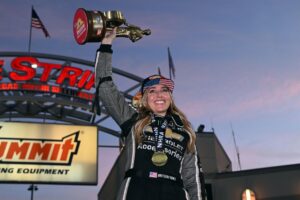 Here are just some of the statistics: two-time NHRA Top Fuel Champion (2017, 2022); 2013 NHRA Rookie of the Year; 19 event titles, making her the winningest female Top Fuel driver in NHRA history; 21 runner-up finishes; 319 round wins; the elapsed time national record (3.623 seconds); the national record speed (343.51 mph); the first driver in NHRA history to eclipse 340 mph (April 25, 2025); 12 runs at more than 340 mph; reset the national speed record four times in 2025 alone.