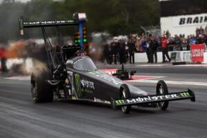 Two-time NHRA Top Fuel Champion Brittany Force wheeled her Monster Energy Top Fuel Dragster to a run of 3.796 seconds at 334.57 mph in Saturday’s first round of qualifying, the performance placing her eighth on the final eliminations ladder.