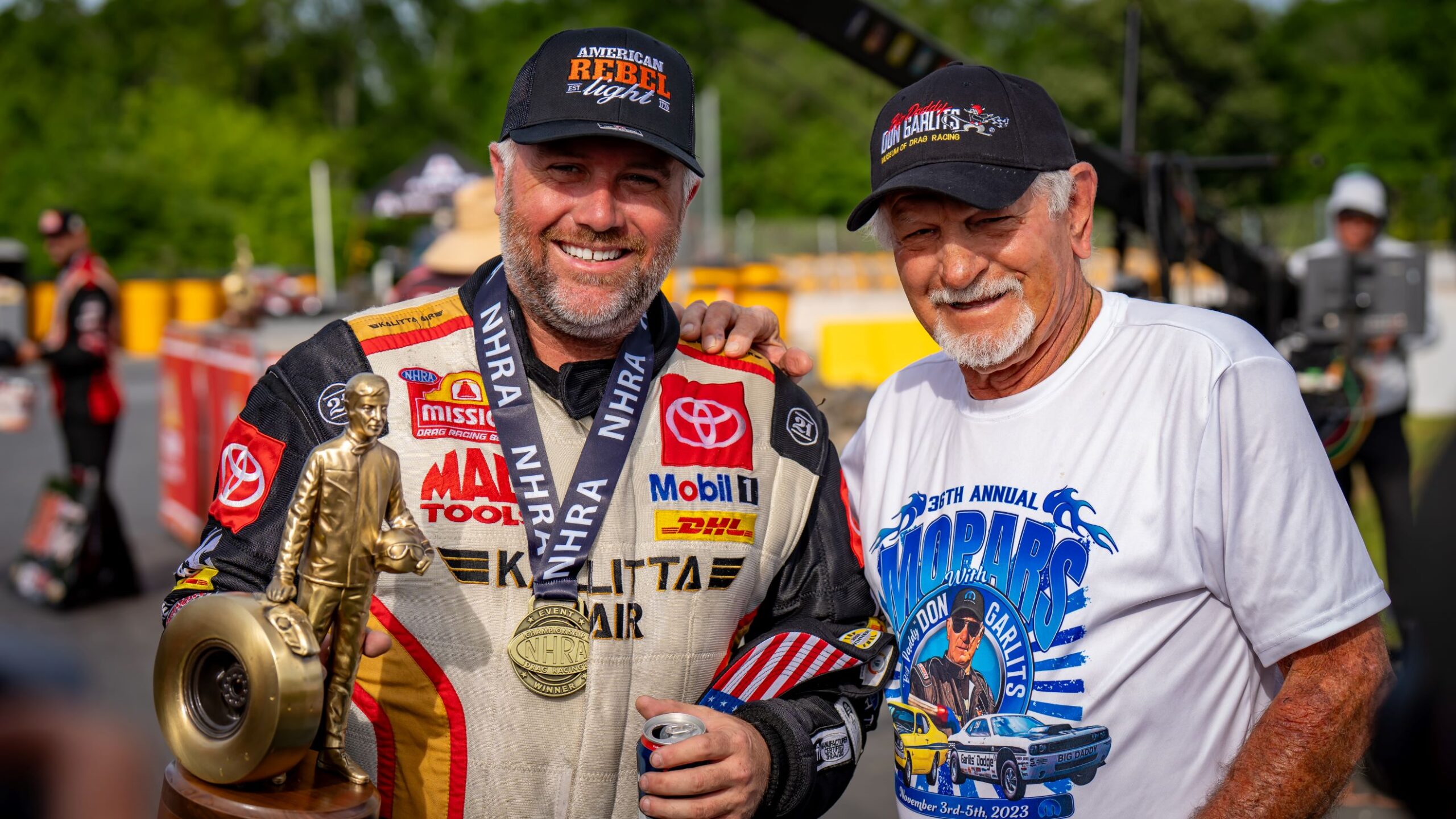 Eliminations: Langdon defeated Ida Zetterstrom and Scott Farley in the first round, Brittany Force and Josh Hart in the second round. He advanced to the final round to face Antron Brown, Tony Stewart and Justin Ashley. In the final, Ashley was off the starting line first, but Langdon’s Future Energy Solutions dragster was not to be denied. Langdon drove around Ashley with a 3.714-second pass at 330.63 mph to win the 1,000th Top Fuel race in NHRA history. After the run, NHRA legend Don Garlits, the winner of the first Top Fuel race in 1963, presented the special 1,000th race trophy, a replica of the one Garlits won in 1963, to Langdon. It was Langdon’s second win of the season.