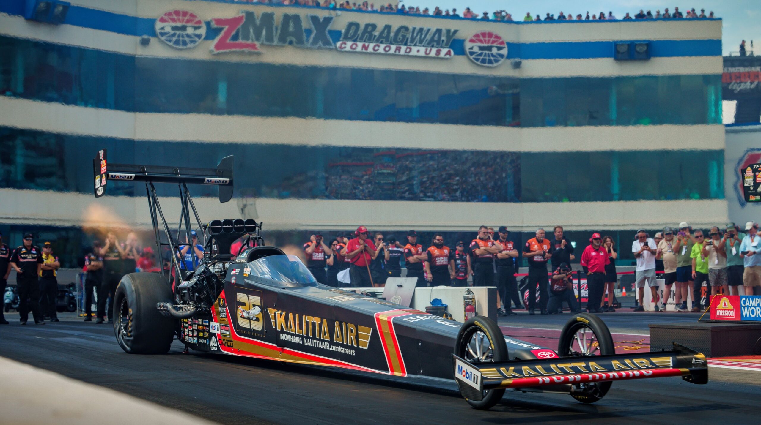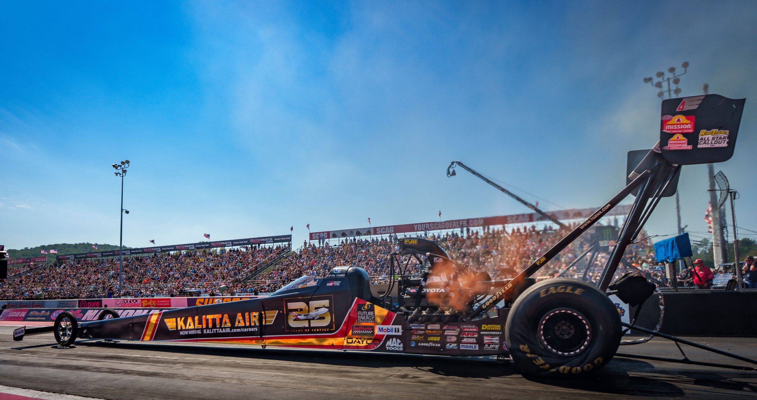 Eliminations: Kalitta defeated reigning Top Fuel champion Antron Brown in the first round and advanced to a second-round matchup with incoming points leader Tony Stewart. Both drivers walked away from a significant racing incident that happened during the round. Immediately after Kalitta crossed the finish line at 335 mph, an apparent front-tire issue propelled the Mac Tools dragster into the left lane where Kalitta made significant contact with Stewart. Kalitta’s car bounced off Stewart’s car and spun then shredding the left-rear tire before coming to a stop in the middle of the racetrack. Stewart’s car flipped on its side before going back onto its wheels where it slid against the wall until it came to a stop.