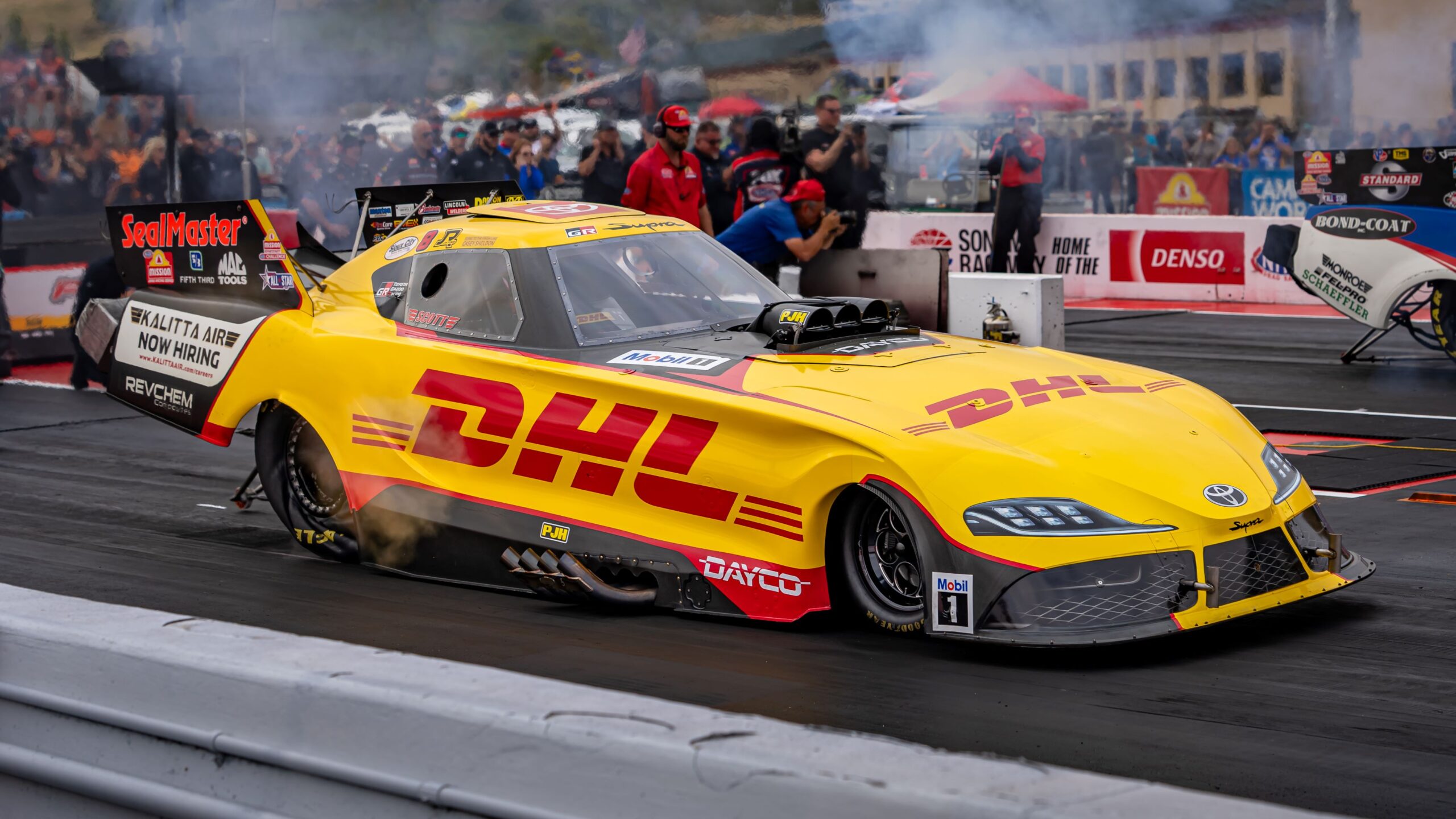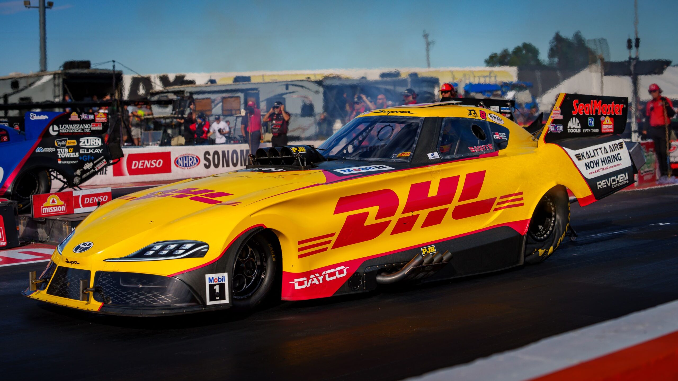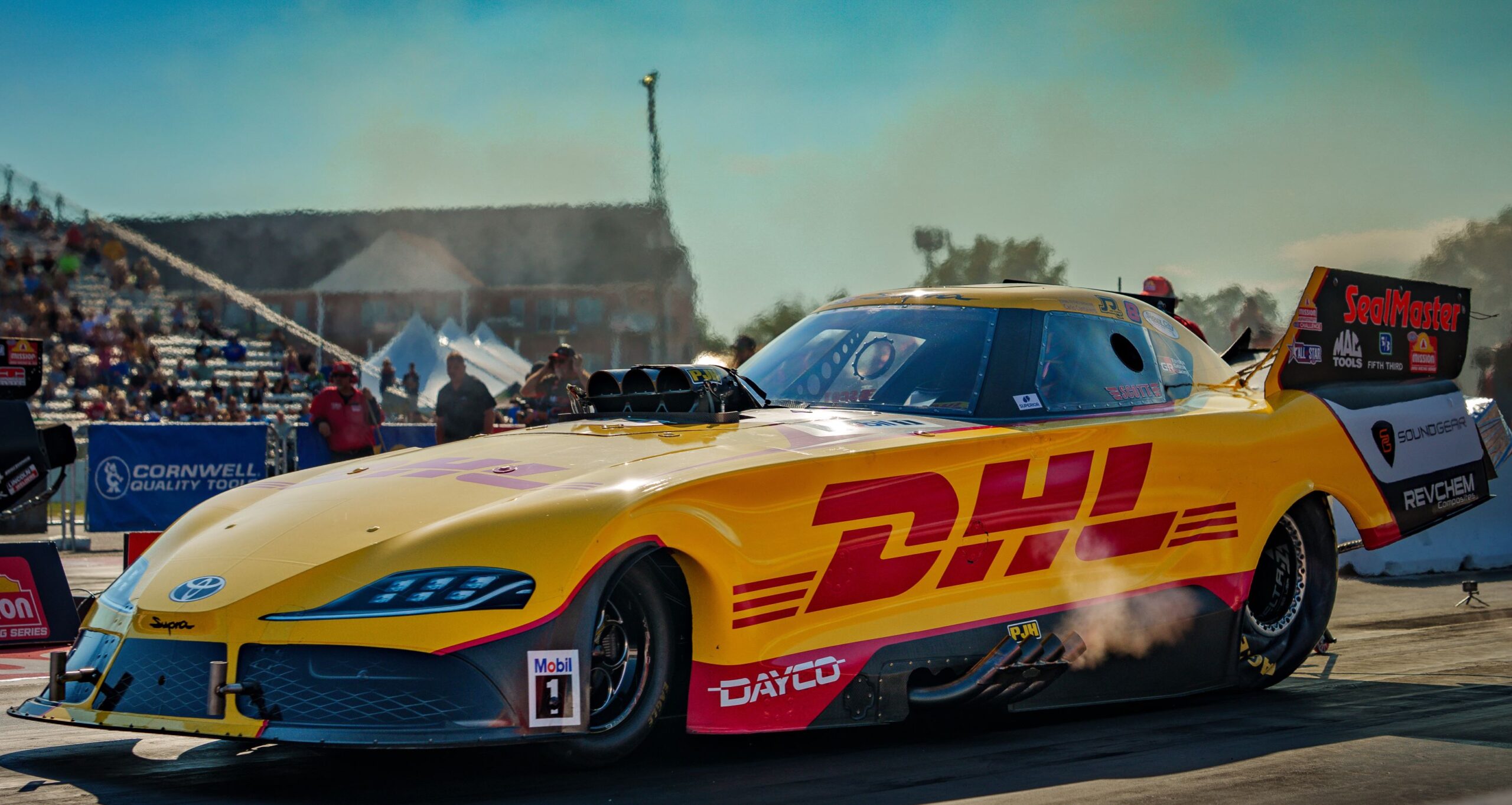 the weekend Friday afternoon. The DHL GR Supra reached the finish line in 3.944 seconds at 326.95 mph. It was the quickest run of the session, but four drivers made better runs in the subsequent qualifying sessions.