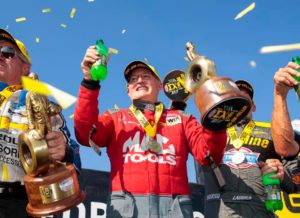 Kalitta won a thriller in his opening round win, running identical 3.721-second passes with Clay Millican, but Kalitta’s .060 reaction time gave him the holeshot victory by .003 seconds. He then moved on to face pole-sitter Brittany Force in round two. Once again, Kalitta had the starting line advantage and never trailed in winning by .016 seconds. That sent the Mac Tools Toyota driver into the semifinals where Austin Prock had a slight lead at the tree, but was up in smoke early as Kalitta went straight down the track for the victory.