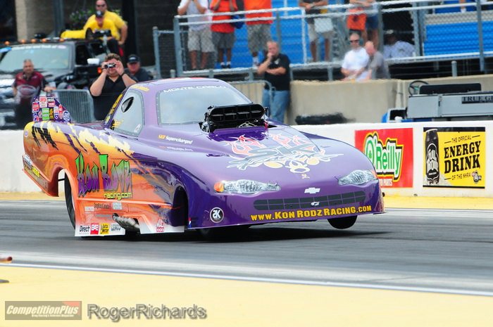 Every single round of elimination would prove to be a tight race with some of the strongest cars in the country. A #7 qualifying position meant a first round meeting with #10 qualifier Steve Gasparrelli. Crew chief Randy Anderson’s tune-up gave Cassie the power to send Steve packing, 5.66 to a losing 5.68. In the second round, “Sassy” Cassie eliminated John Lombardo Jr., 5.62 over his 5.63. In Simonton’s first semifinal appearance in NHRA Top Alcohol Funny Car competition, she drove the Kon Rodz Monte Carlo to a 5.65, too much for Mickey Ferro’s 5.69.
