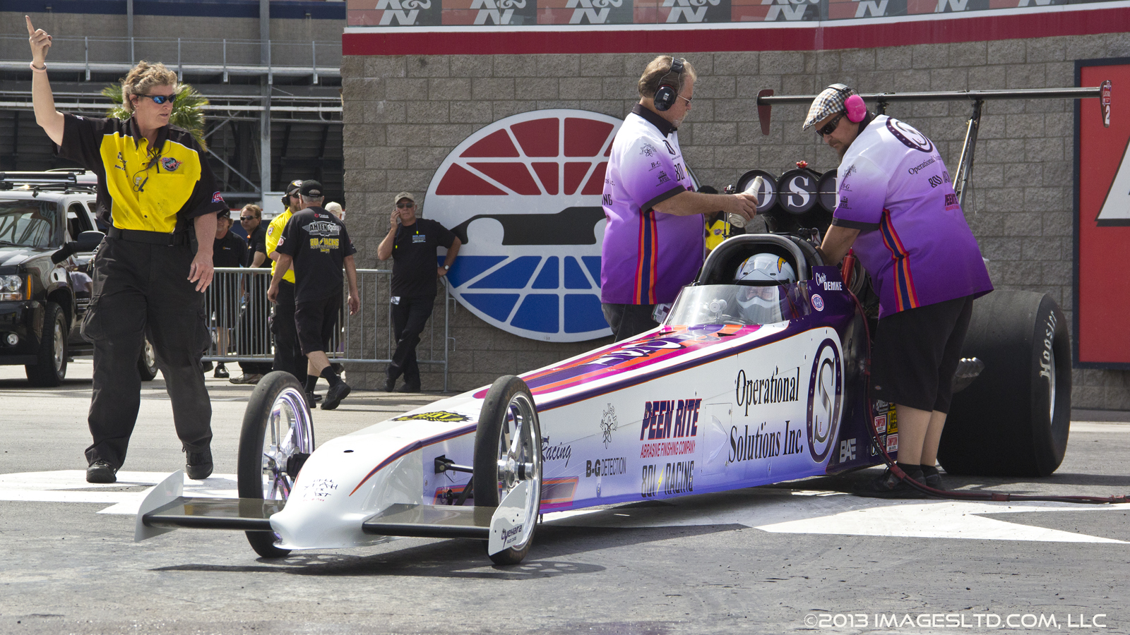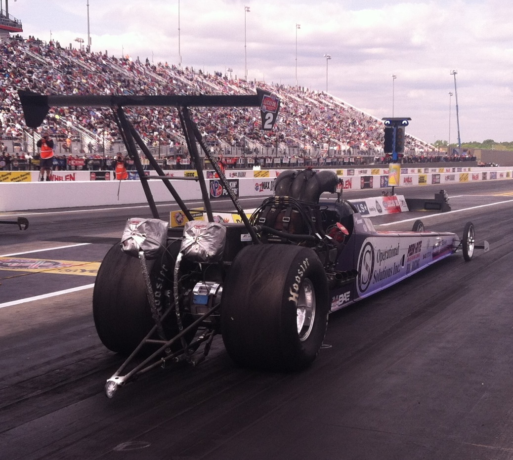 Knowing they were short a qualifying session going into the race, the team set the car up to make a strong yet conservative pass during Friday’s sole qualifying session. Driver Chris Demke piloted the Peen Rite/OSI/801 Racing dragster to the second qualifying position, 5.36 at 264 mph, sitting behind rival Jim Whiteley.