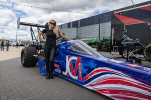 week’s Lucas Oil NHRA Nationals in Brainerd, Minnesota. The Swedish sensation is ready to take American drag racing by storm in her patriotic red, white, and blue JCM Racing VP Racing Fuels/Edelbrock/Comp Cams/Dodge Top Fuel Dragster.