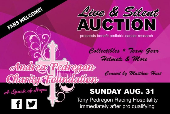 If you’re at Lucas Oil Raceway for the U.S. Nationals this weekend, put our charity auction on your list of things to do! Fans who stop by the Tony Pedregon Racing pit this afternoon can get a sneak peek at the great items we will have up for bid. From die casts and crew shirts to signed helmets and even Indianapolis Colts VIP sideline tickets, there’s something for everyone. And, 2012 “Hoosier Rock Idol” Matthew Hurt is going to perform for us! Hope to see you after pro qualifying on Sunday.