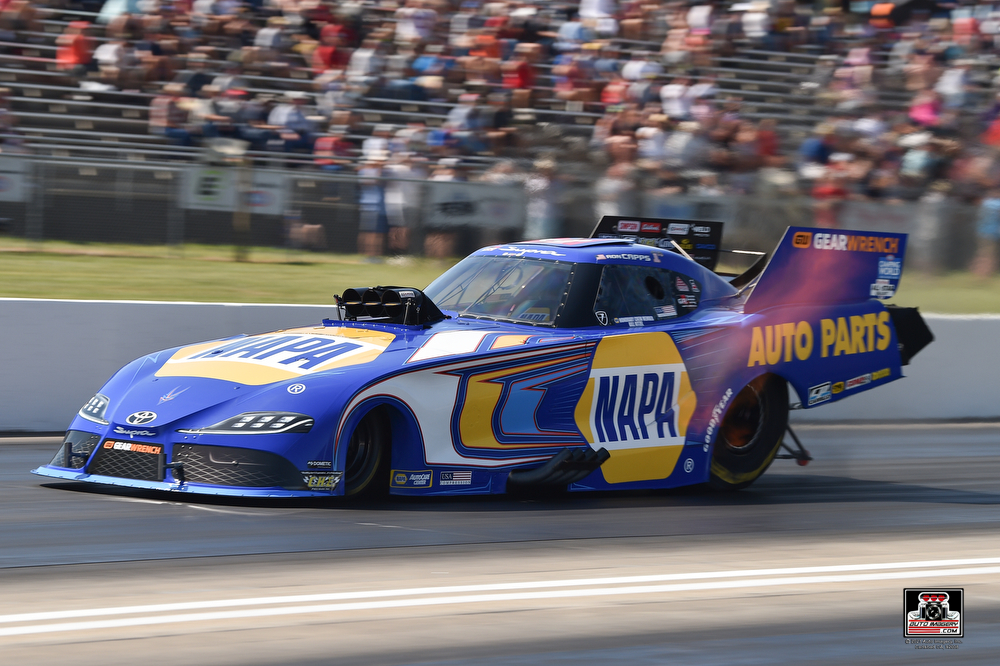 Starting from the No. 4 seed, Capps’ march to the final round began with a round-one matchup versus John Force who entered the race weekend ranked fourth in the Funny Car standings, trailing No. 3-ranked Capps. Aboard the NAPA AUTO PARTS GR Supra, Capps powered to a winning 3.931 E.T. to outpace Force’s 4.022-second effort, effectively halting Force’s chances at making any points gains on Capps. In his quarterfinal contest, Capps was awarded the automatic win on a solo run when Bobby Bode was unable to put his car in reverse following the burnout, setting up a semifinal match versus Alexis DeJoria. Against DeJoria, Capps drove the NAPA Supra to the finish line in 3.955 seconds while DeJoria fouled out when she stood on the throttle too early and red lit.