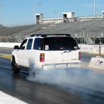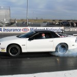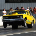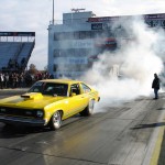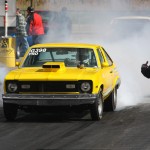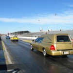 First, Kristina fired the blue Camaro and rolled to the starting line. As she waited, Jesse lit the yellow Nova and moved into position in the water box. At that point, the driver of the hearse cranked the ignition and put the gold Lincoln into gear. With a quick signal, Kristina launched off the starting line as Jesse performed a blazing burnout producing a wall of white smoke…through which the hearse came blasting with “Julio” on board!