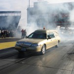 With the rest of the immediate family in the dignitary car, the four machines began one last parade to the finish line for Chris Garcia. Each of the one hundred procession vehicles was permitted to follow after performing an obligatory burnout to the cheers of the assemblage. After everything from minivans to fast street machines had covered the GMP quarter-mile, the massive group was reassembled in the pit area for the traditional drive to the cemetery.