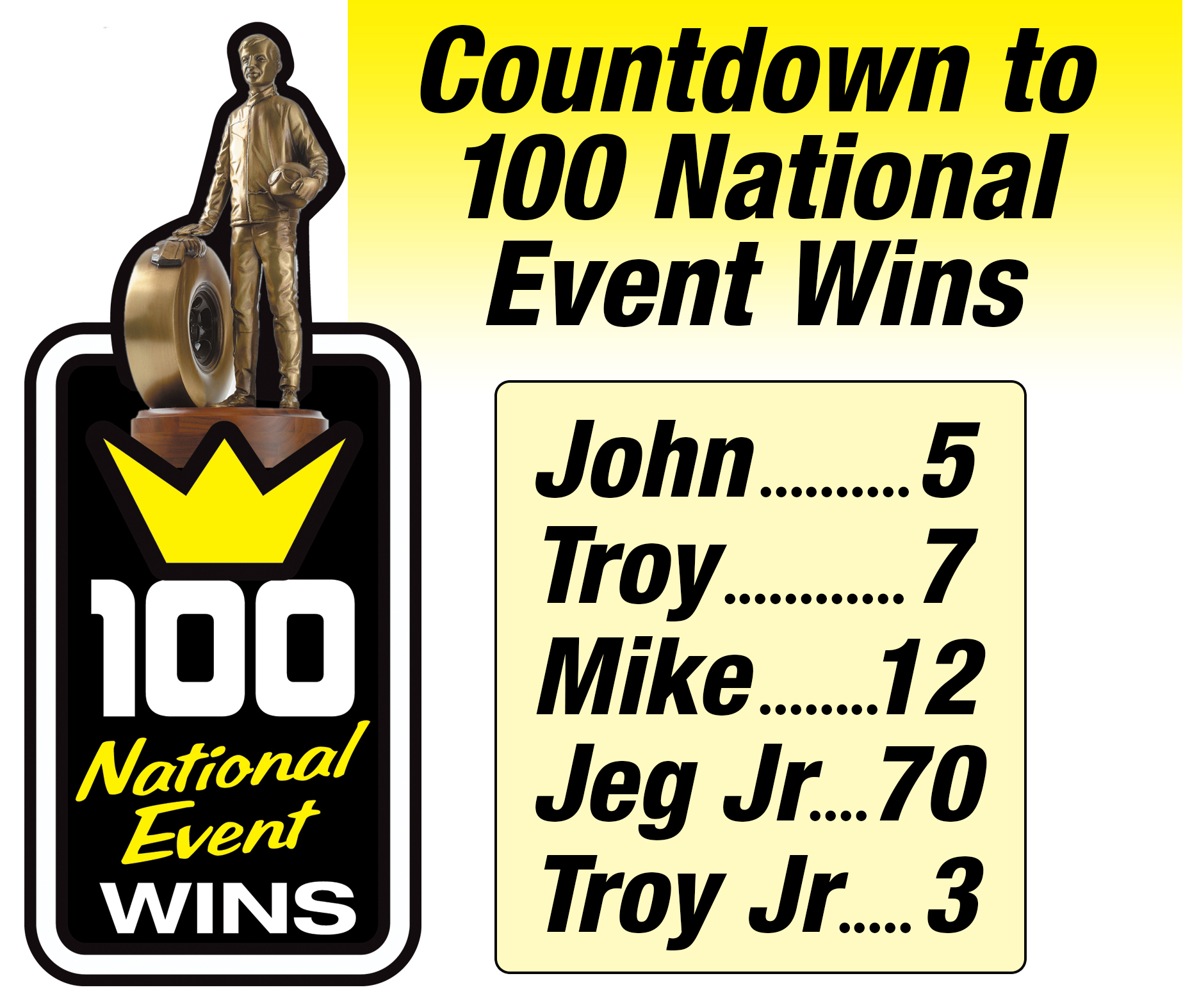 “I think we’ll hit 100 before the year’s over, maybe even this weekend at Indy. Troy Jr. is real hot and Jeg and Troy have both won races this year. It would be neat to see it happen there because that race has so much history.”