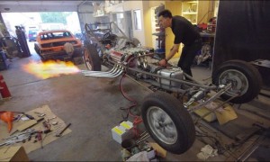 Sydney Allard’s 1961 Allard Chrysler dragster is fired up after being silent since 1964. OK historians, log these details in your book of legends; the date – Sunday July 1st; the place – the workshop at Andy Robinson Race Cars in the UK; the