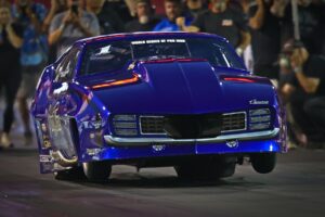 Behind the wheel of his ProCharged “Hells Bells” ’69 Camaro, Camp drove around a slowing Derek Ward in the first round with a 3.709 at 200.44 to Ward’s 5.865. He left first in the second round over Scott Lang, improving to a 3.689 at 202.88 to beat Lang’s 3.725. The Canonsburg, Pennsylvania-based driver then picked up a holeshot win over fellow Keystone State racer and points leader Kurt Steding in a 3.674-to-3.643 semifinal match.