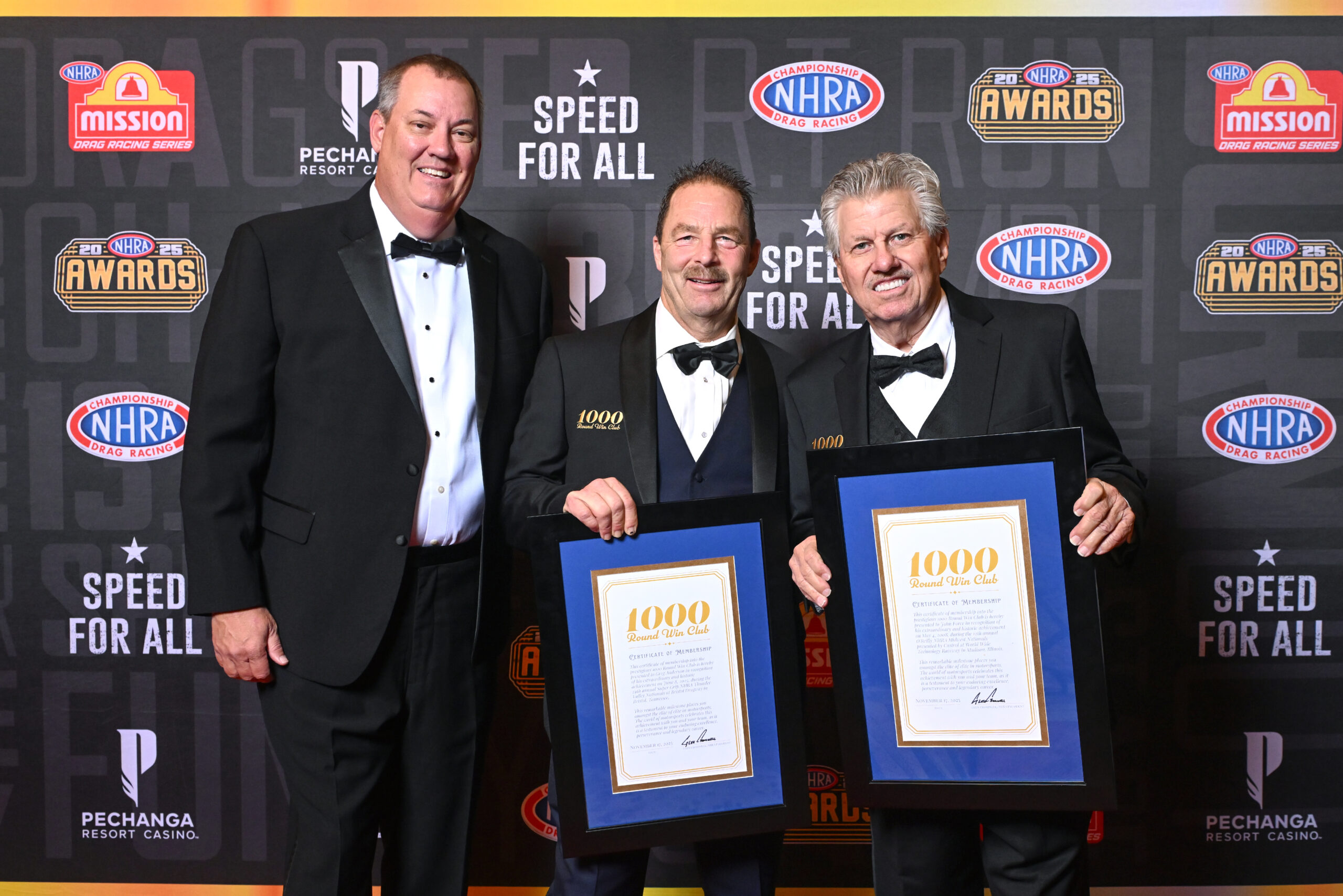 Car world champion John Force and 6-time Pro Stock world champion Greg Anderson were installed as the first two members of the 1000 Round Win Club. Force and Anderson each received custom embroidered tuxedo jackets as well as framed certificates of membership into arguably the most exclusive achievement club in motorsports.
