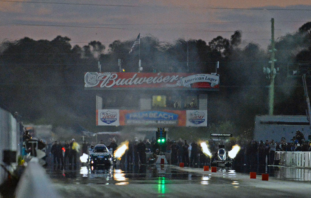 Winter Warm-Up posting the quickest elapsed time of the day for the Funny Cars, a 4.013 second blast but for a couple hundred feet it looked like he might not be the first to the finish line. In the lane beside the 16-time Funny Car champion was 2013 Auto Club Rookie of the Year and Top Fuel driver Brittany Force.