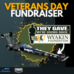“We’re proud to be working with the Wyakin Foundation and are thrilled about the launch of Racing for Warriors leading up to the NHRA Auto Club Finals,” said Justin Ashley, the Top Fuel points leader. “Phillips Connect has been a long-time supporter of veterans and the work that the Wyakin Foundation is doing is so important to the health and stability of our veterans. We have some great prizes available to everyone that donates.”