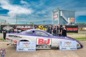 In one of the most exciting displays on the starting line, the J&A Service Funny Car battle culminated in Steve Macklyn’s well-deserved win over Jim Whiteley. Macklyn left the line first, propelling him to victory. Both Steve and Jim suffered mechanical issues, but Steve prevailed due to his starting line advantage. This was the teams’ first Funny Car victory. The excitement was visible on the starting line as his sons, Mark and Ryan Macklyn, long-time friend Jerry Ostler, and new-to-the-team tuner Jeff Pierce celebrated the victory. This also was the first Funny Car victory for Jeff Pierce, who has two MWDRS Pro Mod Championships to his credit.