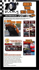10″ Wide Racing Videos released four all new 2010 DVD’s!! Featuring wheel standing, bumper dragging, 7 & 8 second street car drag racing action! Spectacular up-close starting line footage, In-Car Video “ride-a-long’s” in 7 & 8 second cars and pit action between rounds. We bring the Outlaw Street Car Drag Racing experience home to you…get INSIDE the sport with 10? Wide Racing Videos!! If you have a passion for really fast street cars this collection will blow you away!