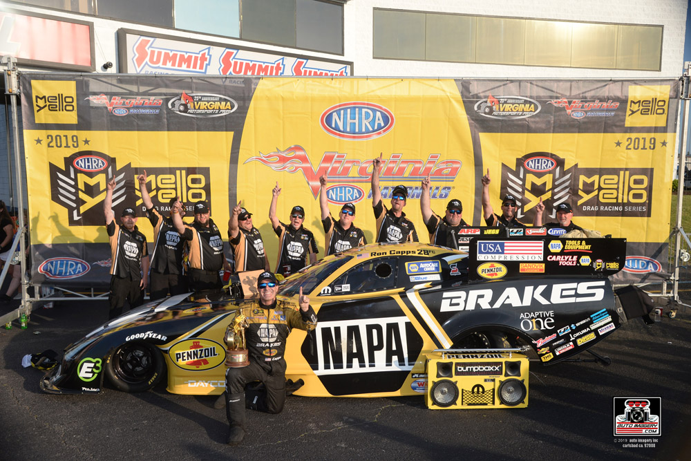 Capps followed his Atlanta triumph two weeks ago with a run through the Funny Car field on an extremely warm day in Virginia to score his 63rd career victory, his 30th win with crew chief Rahn Tobler, all since 2012, and his first Wally trophy at Virginia Motorsports Park.