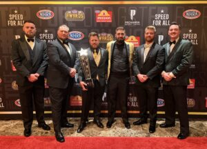 2025 NHRA Rookie the Year Spencer Hyde (third from left) posed with trophy and his Head Inc Funny Car team, photo credit Courtney Enders