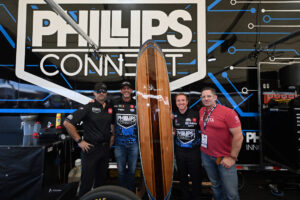 the NHRA Lucas Oil Winternationals the rising star presented a custom surfboard to Phillips Connect CEO Rob Phillips to commemorate last year’s win at the NHRA Lucas Oil Winternationals. Ashley and the Phillips Connect Toyota Top Fuel team surprised Phillips with the surfboard following the first warm-up of the day. The custom board was made by Michael Quesenbury with Handmade in California who has a personal relationship with co-team owner Dustin Davis. Quesenbury has been working on the custom surfboard, a Longboard Papilionidae, since the beginning of the year and details include pinstriping, Phillips Connect and Justin Ashley team branding, personalization to Rob Phillips and blue colorization to match Phillips Connect brand and look. The longboard measures eight feet six inches long and is made from clear vertical grain Western Red Cedar, reclaimed Redwood, and Alaskan Yellow Cedar.