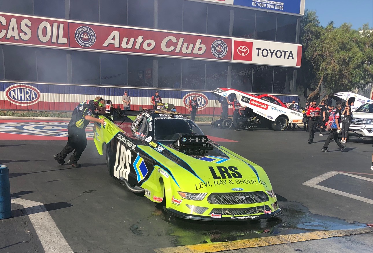 the NHRA Camping World Drag Racing Series competitors. After two days of qualifying, race day began with teams getting their first runs on a track that started out twenty degrees cooler than anything they had seen at the event. The Levi, Ray & Shoup Summit Racing Ford Funny Car team was dealt another setback when a number of Top Fuel dragsters and nitro Funny Cars suffered motor failures that led to lengthy oildown delays. By the time Wilkerson was strapped into his cockpit, the majority of the tuning decisions were made and the track temperatures continued to rise.